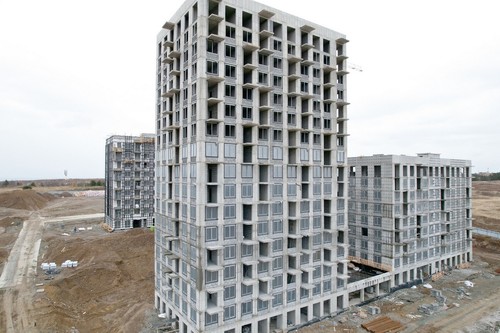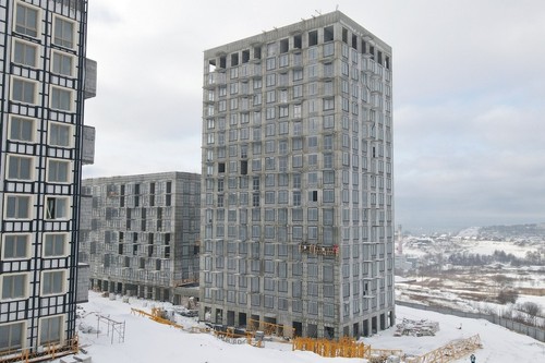 Нейтральные оттенки керамогранита в сочетании с цветовыми акцентами выглядят смело, но только дополняют окружающий пейзаж. Вертикальная игра окон, декоративные вставки и элементы — каждый корпус высотой от 9 до 17 этажей особенный.